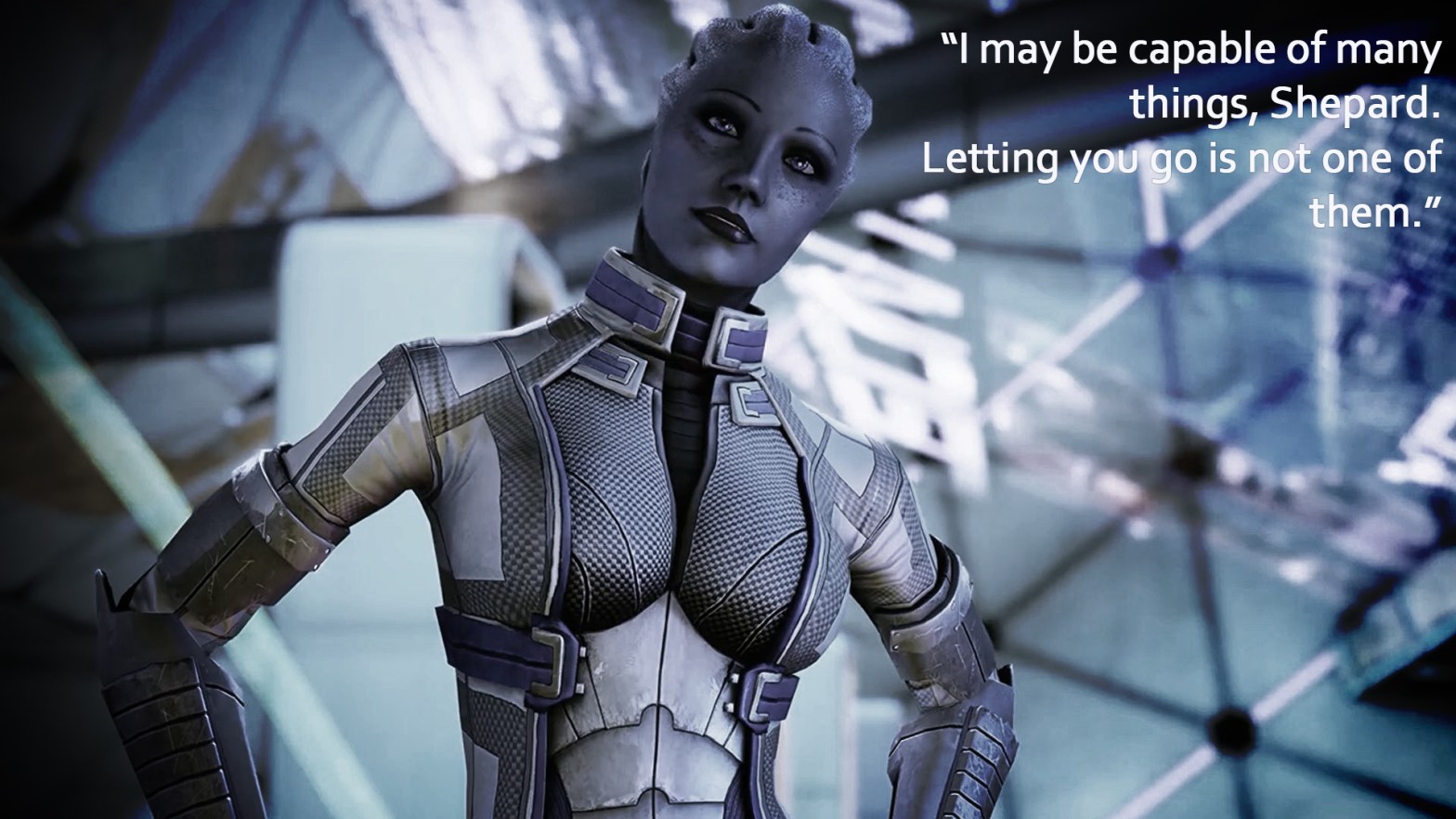 “You are an amazing man of will and drive, Shepard. It is easy for one to forget themselves in you.” The blue alien arm cling to him tenderly. “When you were gone, I felt more hopeless than ever. Still, I knew I had to keep going. I had to do something to continue your fight, but in all that fuss, chasing the Shadow Broker, getting to where I was, I could not forget you. I could not let go.” She nestles her face against his strong shoulders. “Everything I accomplished was because of you, not in spite of you; but you came back, and when I saw you, I wasn’t sure you would like the Liara I was then… who I am now. I was afraid, Shepard.”